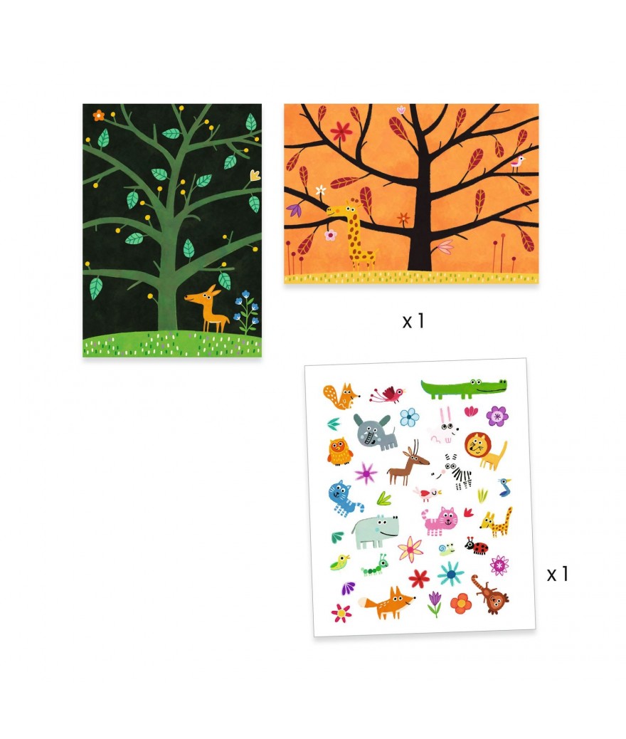 Met meer dan 30 dikke, verplaatsbare stickers en 2 grote geïllustreerde achtergronden, in de savanne of het bos, kunnen kinderen leuke en avontuurlijke scènes verzinnen.