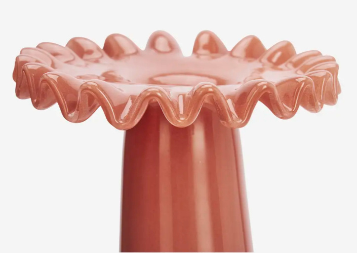 Deze glazen vaas, gemaakt in China, heeft een levendige paprikakleur en is geïnspireerd op art-decodesign. Hij is gemaakt van hoogwaardig glas en heeft een opvallende geplooide rand die kenmerkend is voor die tijd. Het ontwerp voegt verfijning en karakter toe, waardoor hij geschikt is voor diverse interieurstijlen.