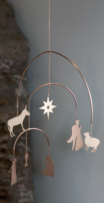 Deze kerstmobiel laat het kersttafereel van de geboorte van Jezus zien.