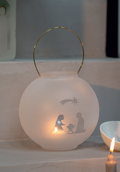 Lantaarn van matglas met erop het kersttafereel · Ontwerp: Yurtcu.