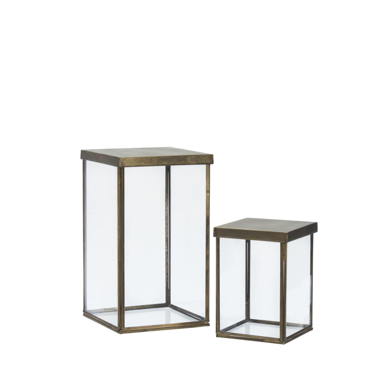 Deze windlichten komen oorspronkelijk uit India en zijn gemaakt van hoogwaardig glas en ijzer. Het heldere glas en de verouderde messing afwerking benadrukken het tijdloze design. Het messingkleurige ijzer draagt bij aan de duurzame en elegante uitstraling.