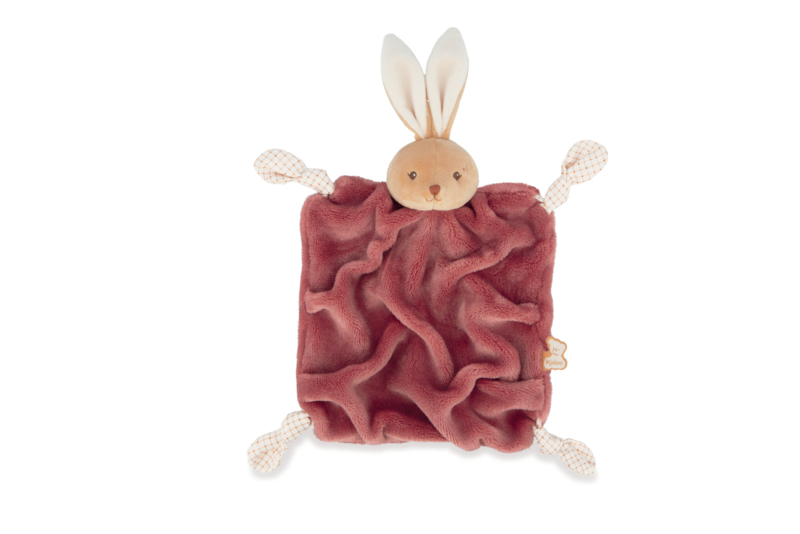Deze vierkante knuffel in een prachtige bordeauxrode kleur heeft 4 knopen waar je kindje mee kan spelen, die ook erg handig zijn om de speen aan te bevestigen en zo dichtbij te houden. Het karamelkleurige konijntje en de ginghamprint geven deze Kaloo knuffel een tijdloze stijl. De prachtige zwaluw die op de knuffel is genaaid, staat synoniem voor frisheid, vrijheid en vernieuwing.