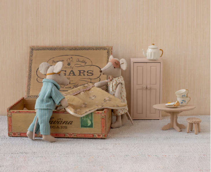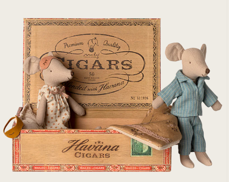 Artikelnummer: 17-5313-00Een klassiek Maileg-item. De muizenmama en papa dragen hun prachtige nachtkleding en slaapmaskers. De sigarenkist is een perfect bed voor een goede nachtrust en zoete dromen.