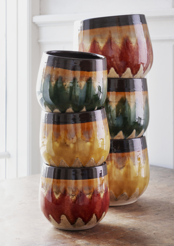 Deze bloempot (je ontvangt de grootste versie die op de afbeelding staat) van keramiek is handgemaakt en met de hand gedecoreerd in China, met zachte tinten geel, bruin en beige. Het reactieve glazuur zorgt ervoor dat elk stuk subtiel uniek is in kleur en patroon, wat een eigen karakter weerspiegelt. Geïnspireerd door design uit de jaren 50, bieden deze potten een creatief element voor plantenstyling, geschikt voor planken, vensterbanken of bijzettafels.