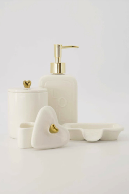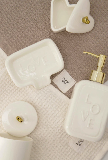 De pot heeft een mooie witte kleur, met een goudkleurig hartje op het deksel als subtiel detail. Dankzij het keramische materiaal voelt de bewaarpot stevig en time-less aan, een fijn item voor je badkamer of slaapkamer.
