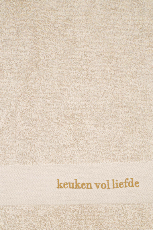 De set bestaat uit een wit theedoek met oker hartjesprint en een zachte okerkleurige keukendoek van 100% katoen, perfect voor dagelijks gebruik.