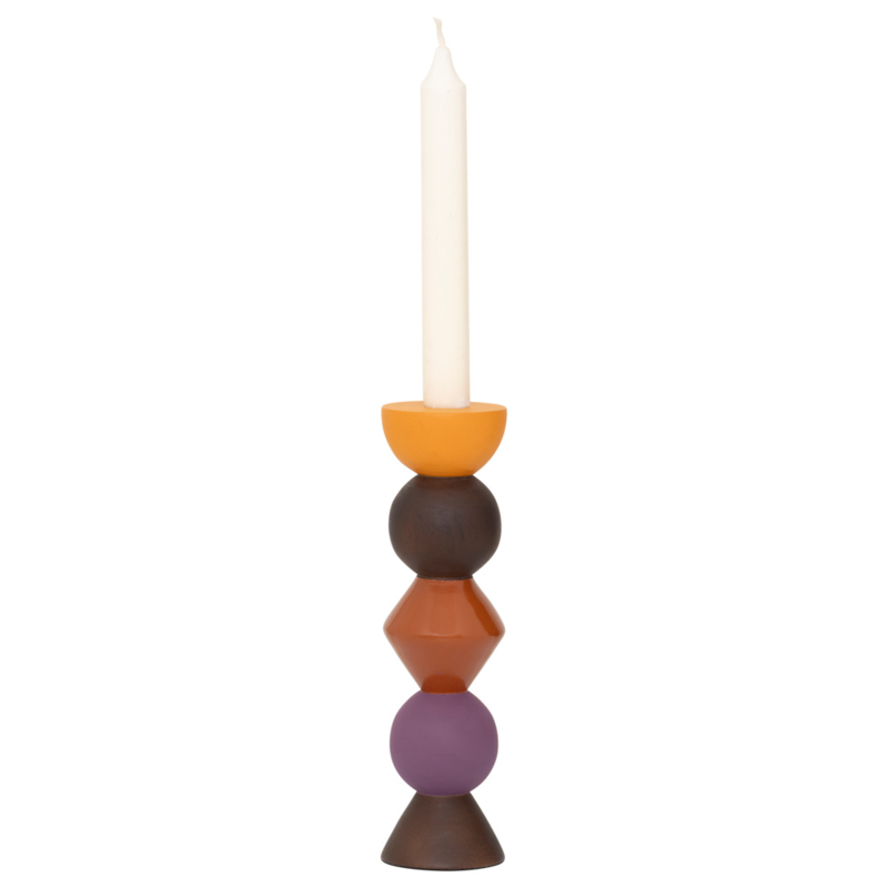 Artikelnummer: 108131Leken is een speelse kaarsenhouder in totemstijl, gemaakt van milieuvriendelijk mangohout in levendige tinten oranje, rood, paars en walnoot.