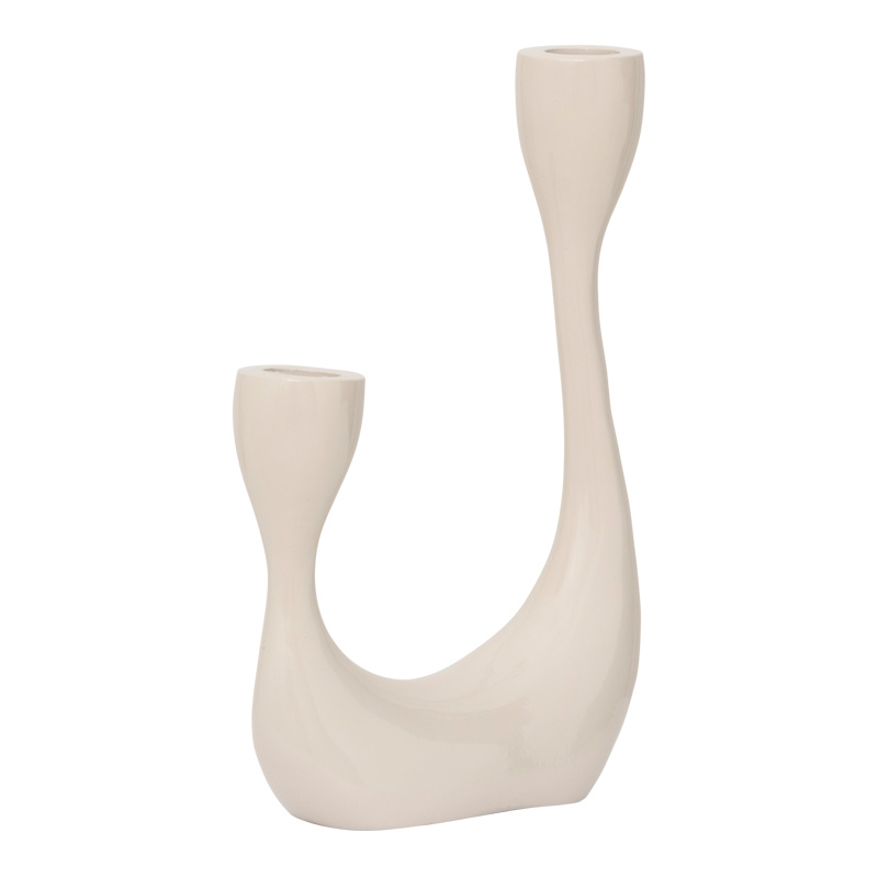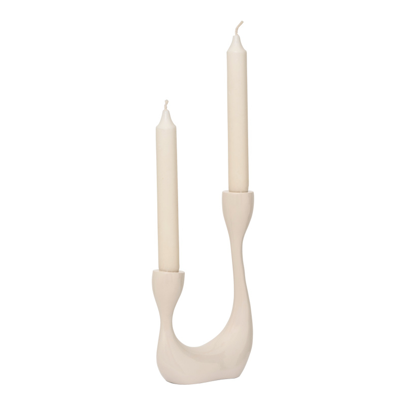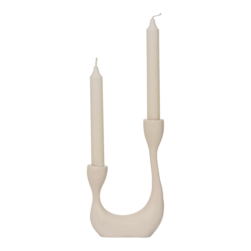 Ontworpen voor twee kaarsen, transformeert hij kaarslicht tot een sereen accent in uw interieur. Een sierlijke kaarsenstandaard die rustige schoonheid en subtiele verfijning toevoegt aan elk interieur.