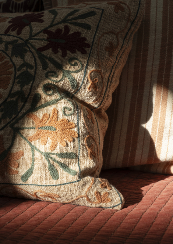 In deze geborduurde kussenhoes met Suzani-motief is het borduurwerk geïnspireerd op de Perzische kunst van Suzani, een ambacht waarvan de naam Perzisch 'naald' betekent. Borduurwerk geïnspireerd op de Perzische kunst van Suzani. De naam Suzani is Perzisch voor 'naald'. Kleurrijke patronen die vaak symbolische betekenissen hebben die verband houden met geluk, gezondheid en vruchtbaarheid. Fijn katoen zorgt voor een ademende, zachte basis, terwijl de gestikte motieven in zand, robijnrood, petrol en meloen een aardse, ambachtelijke uitstraling geven. Elk stuk weerspiegelt een lange traditie, geïnterpreteerd op een eenvoudige, eigentijdse manier, waardoor het een makkelijke aanvulling is voor elke dag.