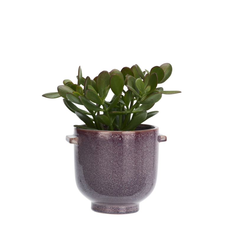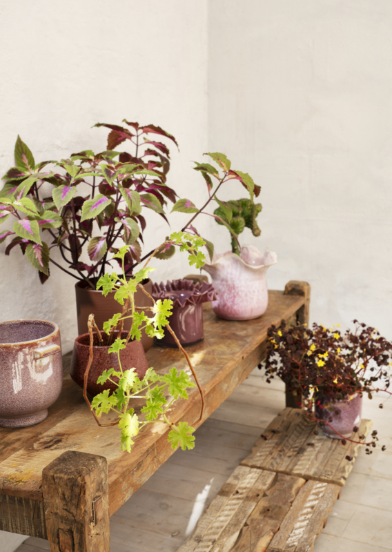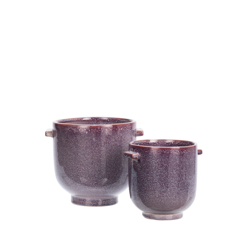 Bij deze bloempot van steengoed wordt de klei gebakken en vervolgens afgewerkt met een glad glazuur. Door het glazuurproces kan de kleurintensiteit per stuk variëren, waardoor elke pot een klein, individueel karakter krijgt. De afwerking combineert paarse en gebroken witte tinten die goed staan bij veel bladvormen en -texturen. Dankzij het duurzame steengoed is deze bloempot geschikt voor dagelijks gebruik, terwijl hij toch een rustige en verfijnde uitstraling behoudt.