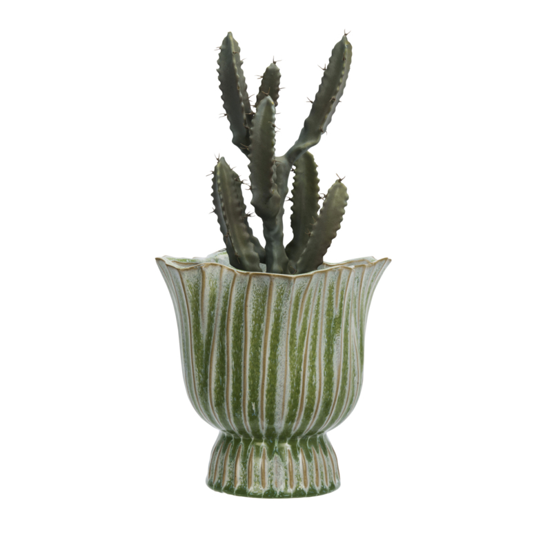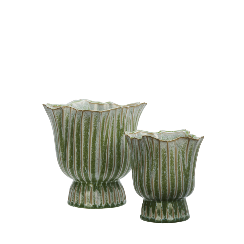 De kern van deze bloempot van steengoed is robuust steengoedklei, in een oven gebakken voor stevigheid en dagelijks gebruik. Door het glazuurproces kan de kleurintensiteit per stuk variëren, waardoor elke pot een ingetogen individualiteit krijgt. Zachte strepen groen, beige en wit vloeien zachtjes over het oppervlak en veranderen subtiel in verschillende lichtinval. Een discreet gevormde rand en een organisch silhouet zorgen voor een bescheiden maar doordachte look. Deze kleine variaties vertellen het verhaal van zorgvuldige handmatige afwerking en geven het stuk een persoonlijke en doorleefde uitstraling.