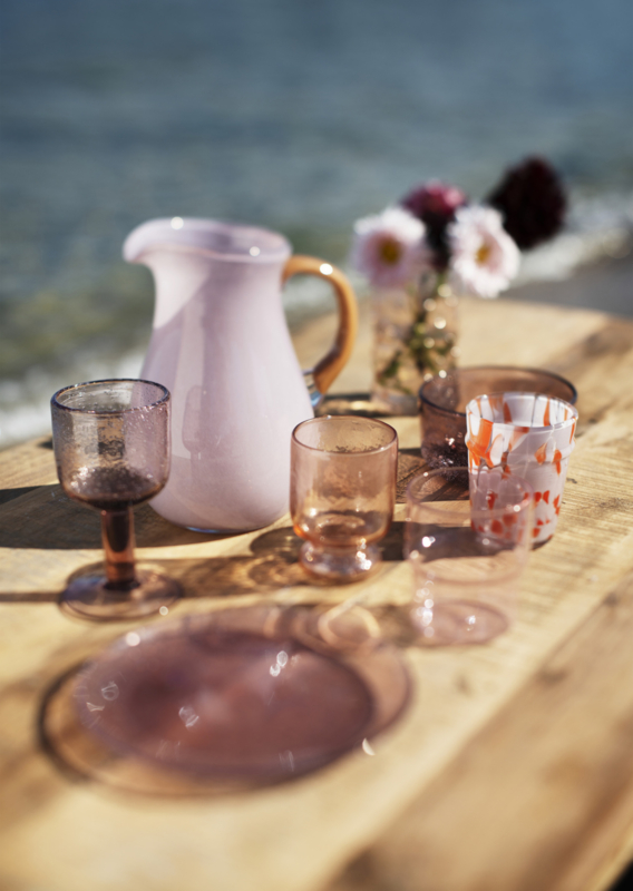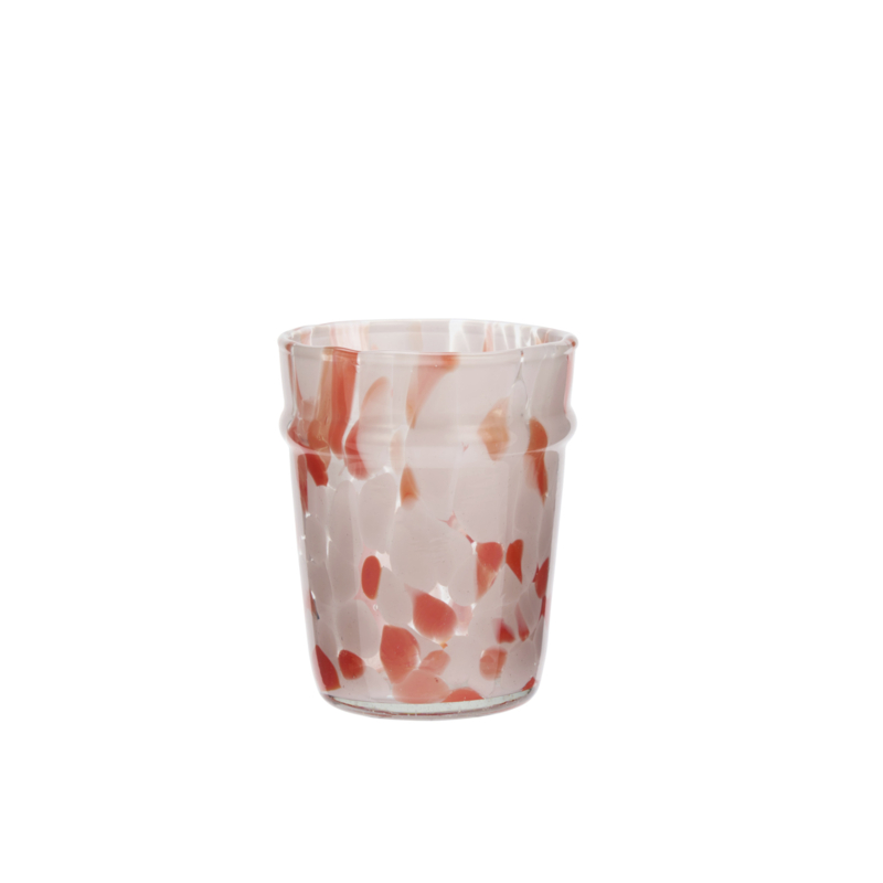 In dit drinkglas wordt helder glas gecombineerd met gedeeltelijk gerecycled glas, waardoor afval wordt geminimaliseerd en de helderheid en glans behouden blijven. Door het handgemaakte hete glasproces zullen de decoratieve gekleurde stippen er per exemplaar iets anders uitzien, wat het individuele karakter benadrukt. Het gladde glazen oppervlak en de heldere roze en oranje tinten maken dit drinkglas gemakkelijk te combineren met zowel eenvoudig wit keramiek als meer opvallend servies.