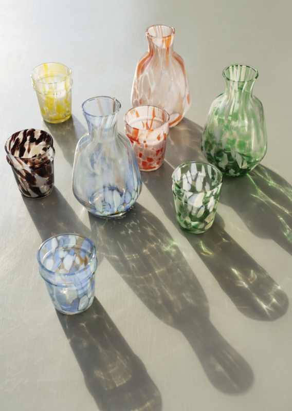 Dit drinkglas is mondgeblazen in Firozabad, het centrum van de Indiase glasindustrie, en brengt een subtiel gevoel van vakmanschap in alledaagse rituelen. Elk stuk wordt gevormd door bekwame glasblazers, waardoor geen twee exemplaren exact hetzelfde zijn. Een uniek patroon en samenspel van kleuren van de glasstippen geeft karakter aan elke omgeving, terwijl het roze, oranje en heldere palet de sfeer licht en ontspannen houdt. De speelse kleurencombinatie en een subtiel humoristische uitstraling maken het gemakkelijk te combineren met wat je al hebt, maar toch onderscheidend genoeg om op te vallen op een gedekte tafel of naast een karaf op een nachtkastje. Handgemaakt vakmanschap zorgt voor een comfortabel gewicht in de hand, ideaal voor water, sap of een kleine cocktail. Verkrijgbaar met een bijpassende waterkan voor een eenvoudige, gecoördineerde set.