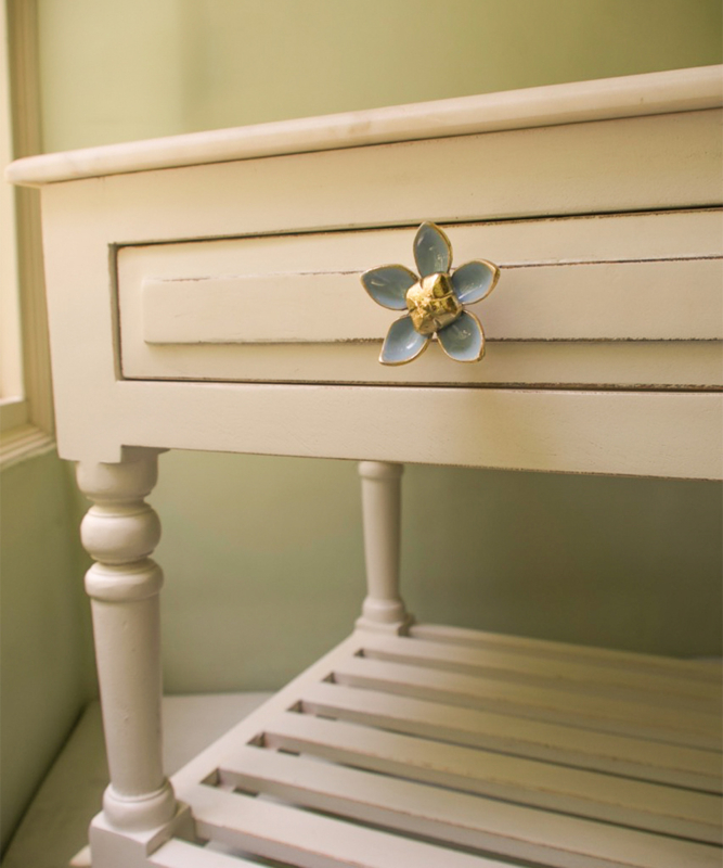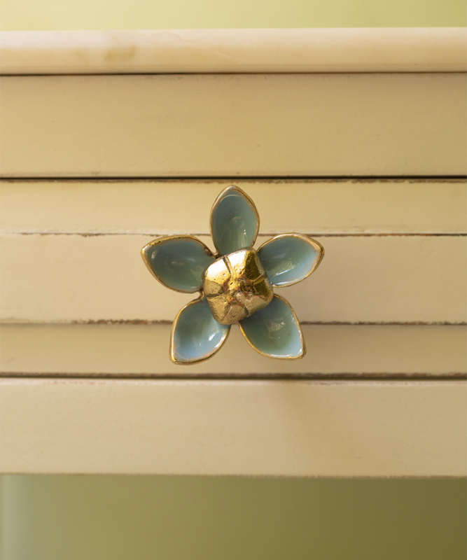 Het is ook zeer geschikt als messing kastknop voor badkamermeubels, commodes of meubels voor de babykamer. In een kinderkamer geven de bloemvorm en de zachtblauwe kleur een speelse, dromerige sfeer aan kledingkasten of speelgoedkasten.