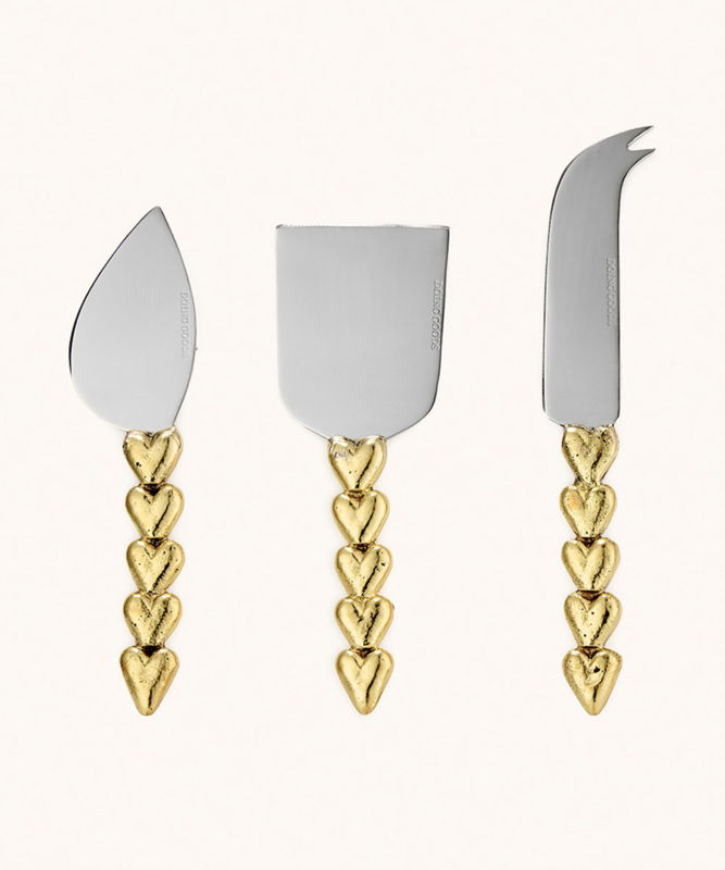 Voeg een vleugje elegantie toe aan uw tafel met de Holly Hart kaasmessenset – een verfijnd trio kaasmessen gemaakt van gepolijst roestvrij staal en verguld messing. Elk mes heeft een hartvormig handvat dat charme en persoonlijkheid toevoegt aan elke kaasplank.