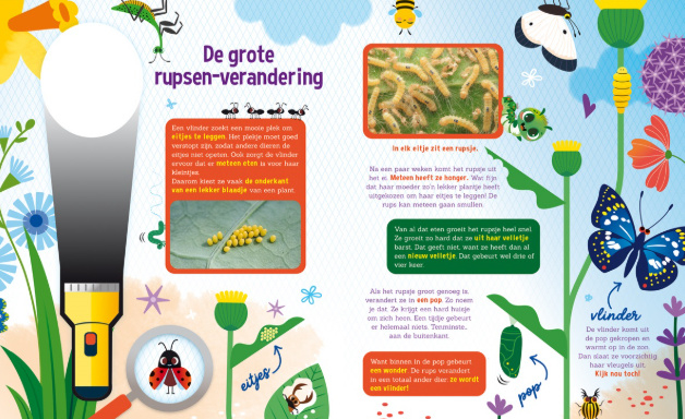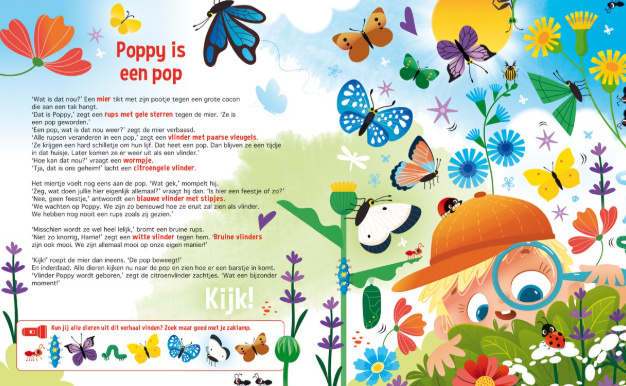 Artikelnummer: speurenvlindersGa samen met rupsje Poppy op avontuur! In dit vrolijke zoek- en (voor)leesboek ontdek je hoe een klein rupsje verandert in een prachtige vlinder. Poppy is nieuwsgierig en wil alles weten over de wereld om haar heen. Help jij haar mee speuren naar het antwoord op haar grote vraag: hoe ziet een vlinder eruit? Met de stevige kartonnen “zaklamp” die bij het boek hoort, kun je zelf op ontdekkingstocht. Schuif de zaklamp achter de pagina’s en zie allerlei verborgen verrassingen verschijnen! Een magische leeservaring die jonge speurneuzen blijft boeien. Dit prachtig geïllustreerde boek combineert spel en educatie: kinderen leren over de metamorfose van rups tot vlinder en worden gestimuleerd om te kijken, zoeken en ontdekken. Perfect voor nieuwsgierige peuters en kleuters vanaf 3 jaar. Een spannend en leerzaam avontuur dat ouders en kinderen samen kunnen beleven. Ideaal als cadeau en gegarandeerd goed voor uren speel- en leesplezier! Bekijk je ook de andere titels in deze serie?