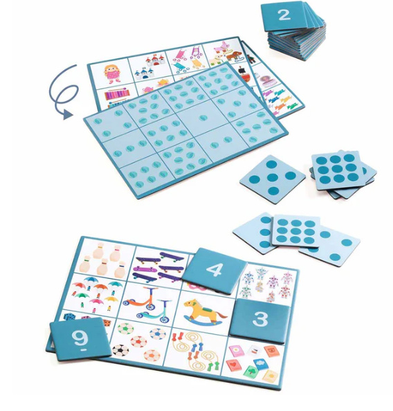 Artikelnummer: DJ082814 lottospellen om te leren tellen. Een spel dat iedereen kent waarmee kinderen leren tellen, aantallen herkennen en hoeveelheden met cijfers leren verbinden, helemaal in het thema speelgoed. Met oplopende moeilijkheidsgraad en makkelijk te controleren oplossingen.