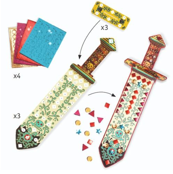Inhoud: 3 zwaarden van dik karton, 4 vellen mozaïekstickers van foampapier, 1 instructieblad.