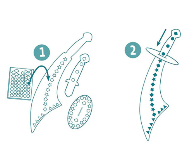 De kinderen zoeken de nummers op de zwaarden en plakken er de bijbehorende metalen stickers op. Daarna hoeven ze zich alleen nog maar onder te dompelen in de fascinerende wereld van piraten en de mooiste avonturen te bedenken!