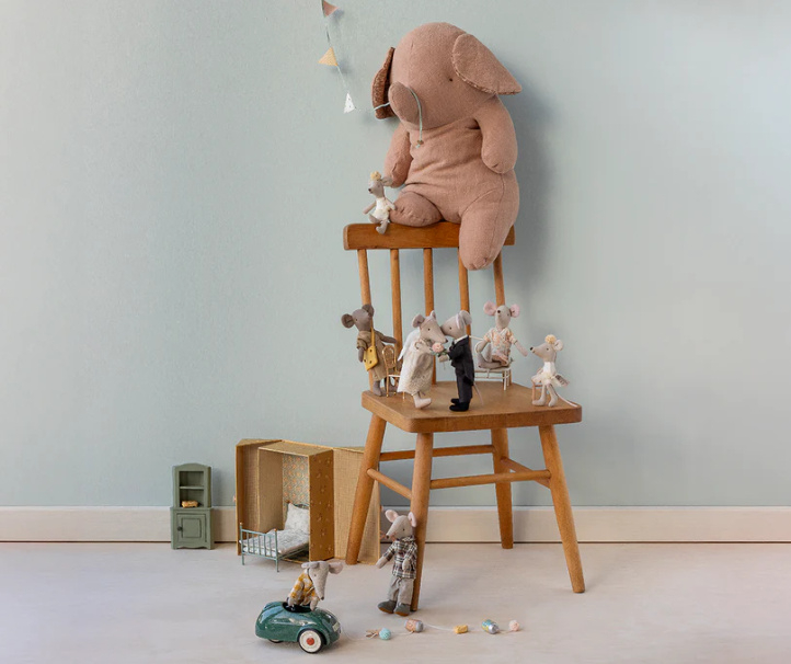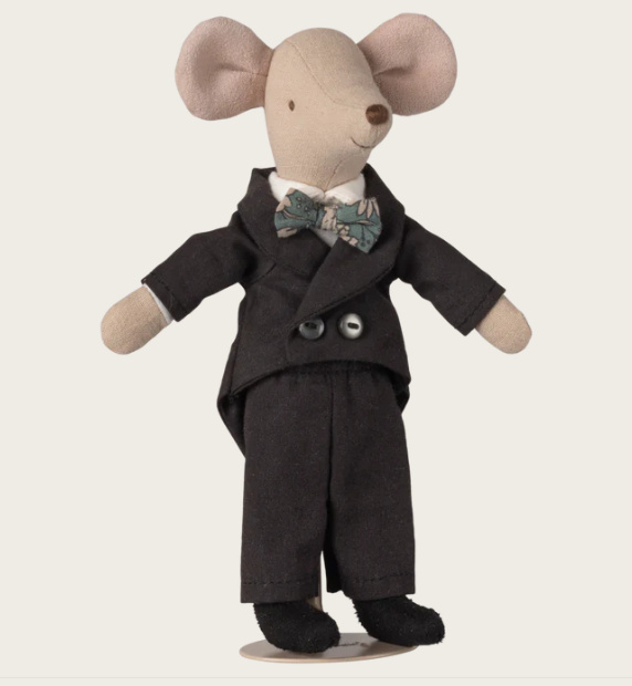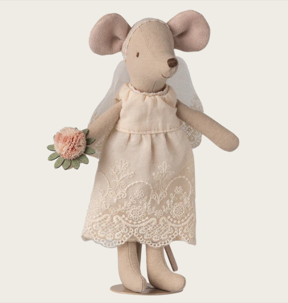 Ze zijn klassiek gekleed in een lange witte jurk, kanten sluier, boeket en smoking. Ze worden geleverd in een mooie doos versierd met Maileg-print.