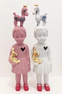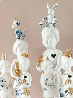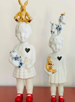 Deze porseleinen popjes, met hun glinsterende gouden details en rode schoentjes, dragen de onmiskenbare signatuur van Lammers&Lammers. Lieflijk, grappig en altijd met een knipoog, stralen ze pure persoonlijkheid uit.