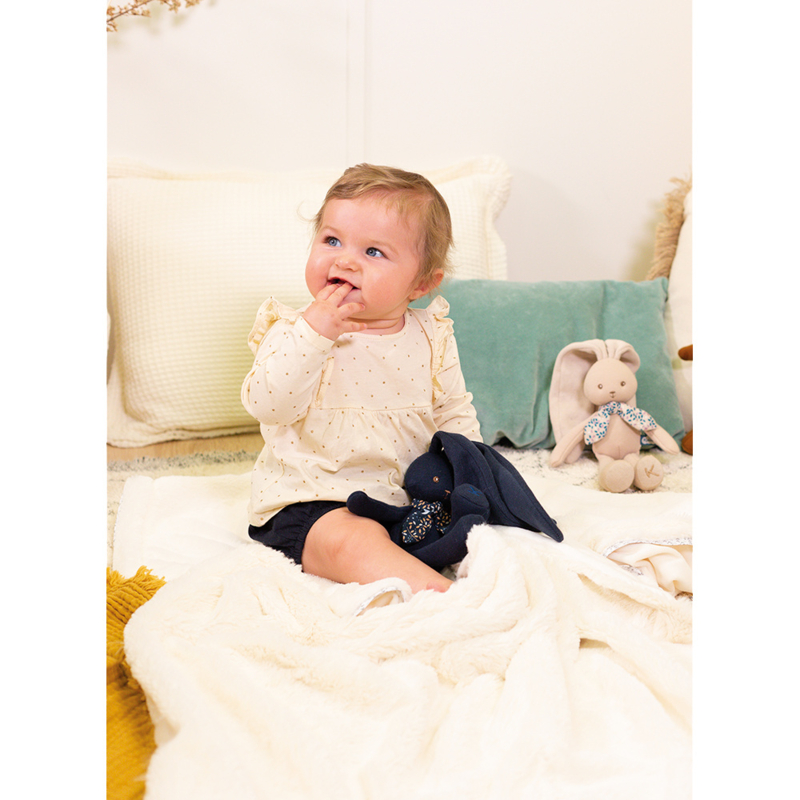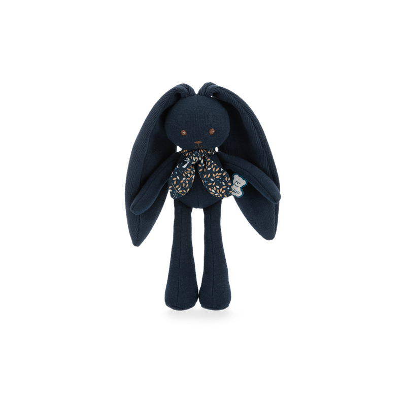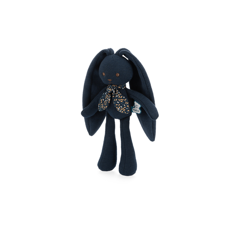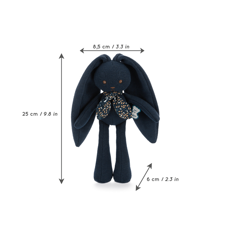 Dit donkerblauwe vrolijk klein konijntje heeft zulke lange oren dat je hem overal kunt vasthaken om hem te bewaren en nooit te verliezen. Je kunt alles met hem doen: op je hoofd staan, schommelen, ophangen aan de wasdraad.