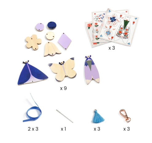 Inhoud: 9 houten onderdelen, 3 vellen met transferstickers, 3 klemsluitingen, 3 pomponnen, 6 satijnachtige lintjes, 1 blad met gedetailleerd stappenplan.