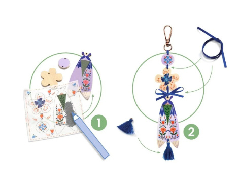 3 mooie houten sieraden samen te stellen met meer dan 100 transferstickers en accessoires. Als de sieraden af zijn kan het kind zijn of haar tas of sleutelhanger versieren.