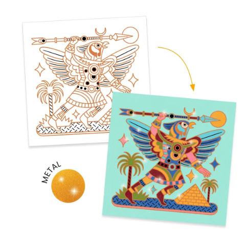 Artikelnummer: DJ09697Dit is een kleuractiviteit waarbij je wegdroomt naar het Egypte ten tijde van de farao's. Het kind kleurt de 4 schilderijtjes in die versierd zijn met goudkleurige lak. De gouden cirkels met reliëf vergemakkelijken het inkleuren: ze leiden de punt van de stift om te voorkomen dat het kind buiten de lijntjes gaat!