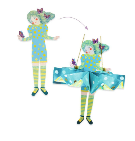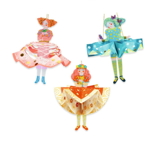 Artikelnummer: DJ09453Een eenvoudige en slimme vouwactiviteit om 3 papieren jurken te maken en de 3 meisjes te hullen in een prachtige en schitterende outfit. 3 mooie mobielen om te versieren met stickers en in je slaapkamer op te hangen.