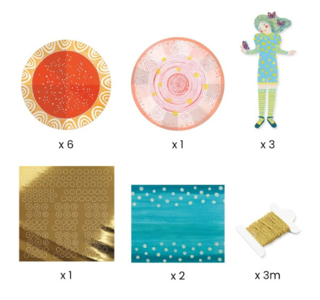 nhoud: 4 geïllustreerde meisjes van karton, 6 jurken van vouwpapier, 2 stickervellen en 3 m goudkleurig draad.