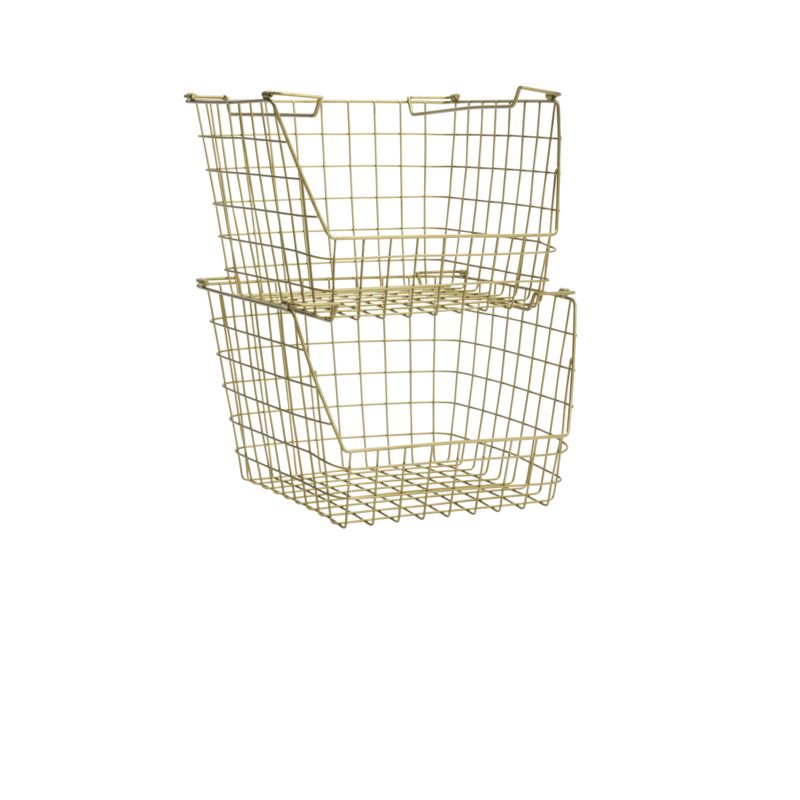 Elke stapelbare ijzeren draadmand is gemaakt van ijzer met handgelast ijzerdraad, wat een stevig gevoel geeft met een subtiel handgemaakt karakter. De antieke messing afwerking zorgt voor een warme, ingetogen sfeer die goed samengaat met hout, steen of geverfde oppervlakken. Omdat elke lasnaad met de hand wordt gemaakt, geven kleine variaties elk stuk een eigen, subtiele individualiteit, terwijl ze toch stevig op elkaar gestapeld kunnen worden.