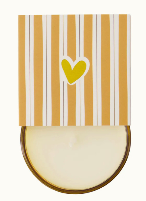 Deze geurkaars is gemaakt van hoogwaardige materialen en heeft een stijlvolle wikkel met witte strepen en een hartje.