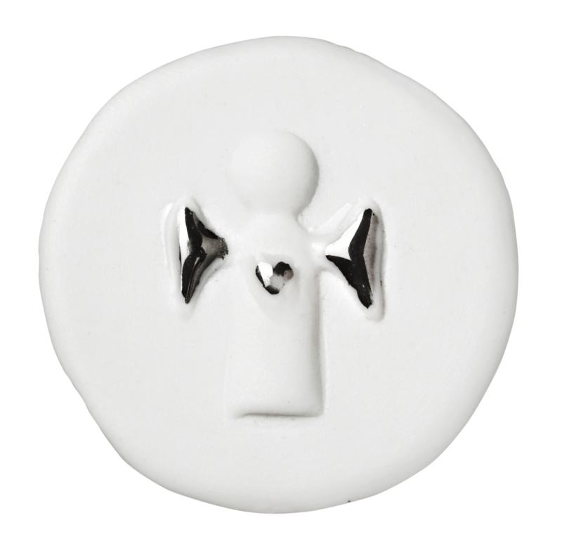 Artikelnummer: 12619Wenszakje met een muntje van porselein. Op de voorkant een engeltje met zilveren details en op de achterkant de woorden: Carry Me ingegraveerd.