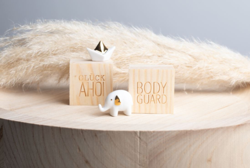Artikelnummer: 15524Houten doosjemet erin een lief porseleinen olifantje met gouden oortjes.