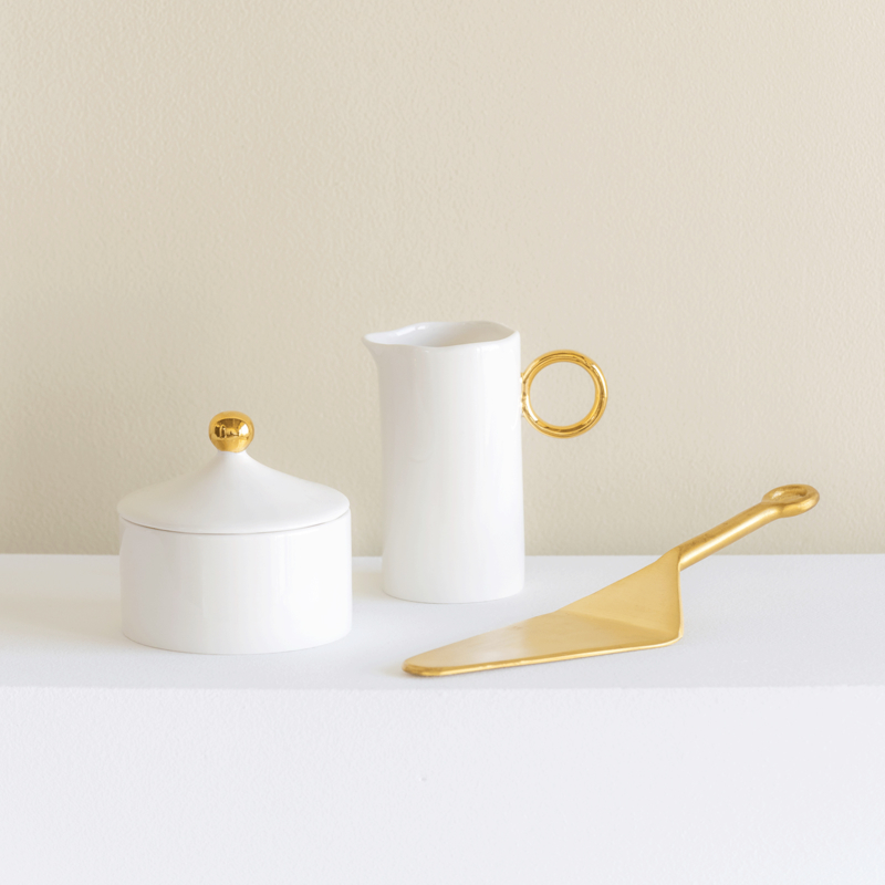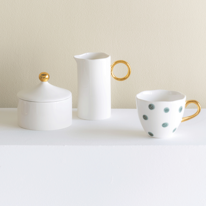 Gemaakt van nieuw beenderporselein en met een gouden stip erop, het past perfect bij de kopjes, borden, kommen en meer van UNC