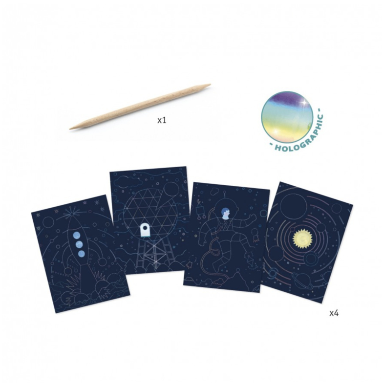Dit knutselset van Djeco bevat 4 verschillende kaarten (20x15 cm) met illustraties van de ruimte en een raket, een houten pen om mee te krassen en een stap-voor-stap instructieboekje.
