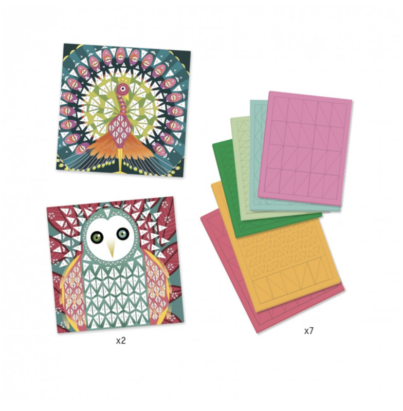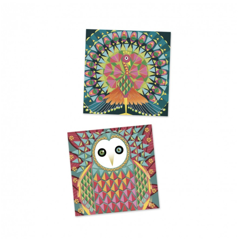De set bestaat uit twee prenten, 1 met een pauw en 1 met een uil. De kaarten zijn genummerd zodat je het bijbehorende foam stickertje in het juiste vakje kunt plakken. Je plakt meerdere lagen over elkaar dus de mozaiek krijgt diepte.