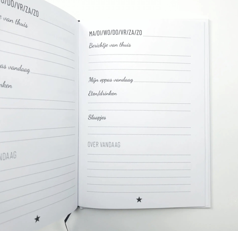 Artikelnummer: 2021-oppasIn dit invulboekje kan de oppas of leidster van het kinderdagverblijf bijhouden wat het kindje allemaal heeft gegeten en gedronken en hoeveel hij of zij heeft geslapen. Er is ruimte voor ruim 80 oppasdagen en tussen de invuldagen door is er voldoende ruimte voor foto’s.