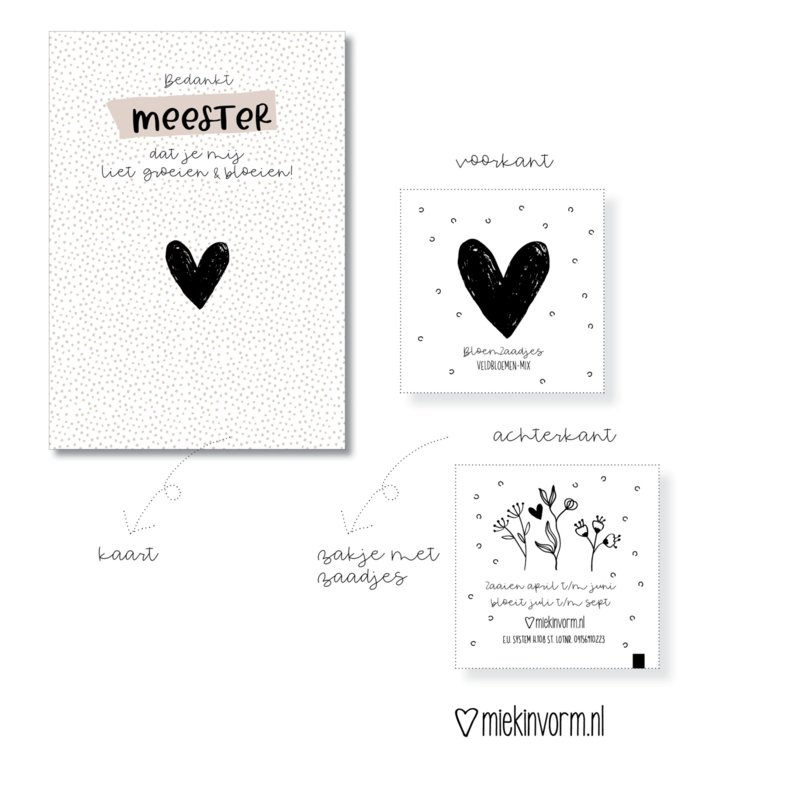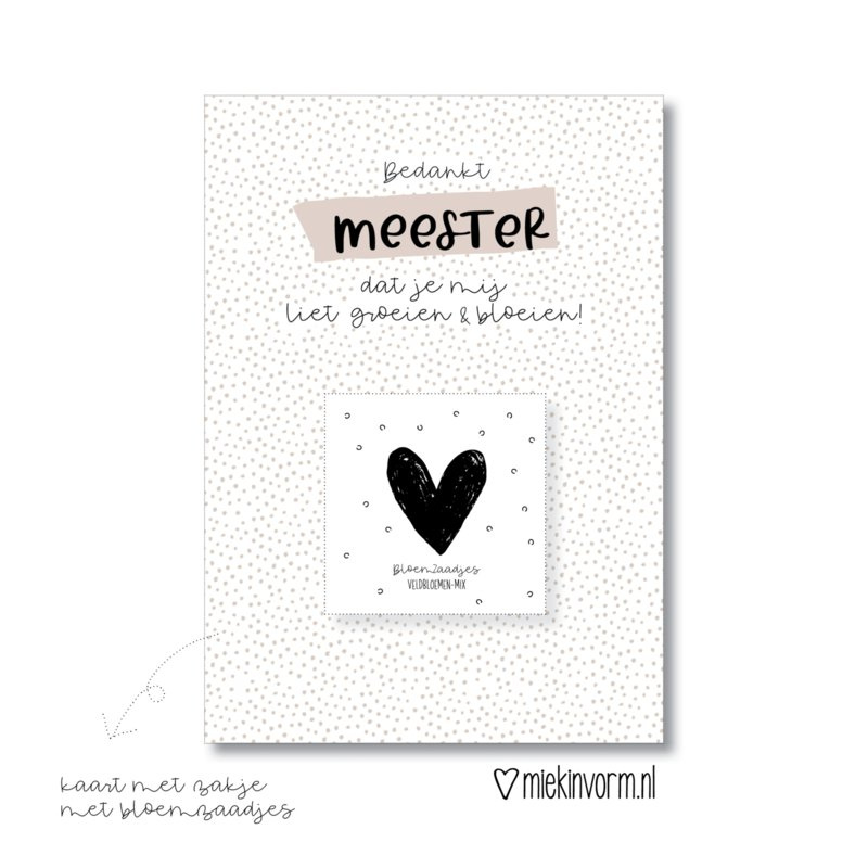 MiekInVorm Ansichtkaart + zakje bloemzaadjes "Bedankt meester dat je mij liet groeien & bloeien"