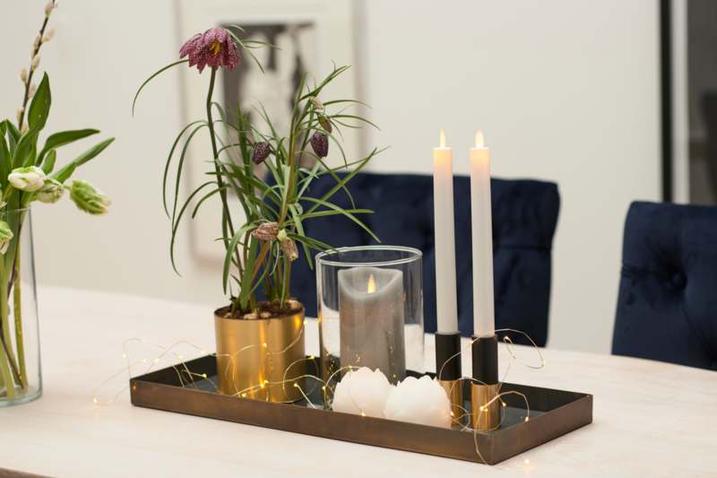 Het decoratieve lichtsnoer Knirke heeft 40 hele fijne LED-lampjes. Het snoer is gemaakt van een fijne gouden draad gedraaid rond een transprarent draad.