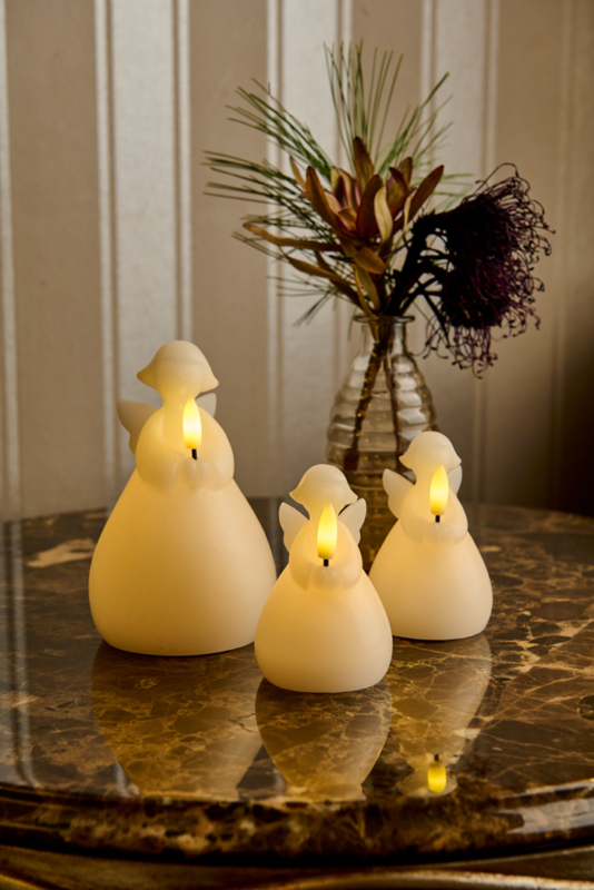 Het engeltje houdt een kaarsje vast waarin een ledlampje zit. Het engeltje is gemaakt van echte wax.