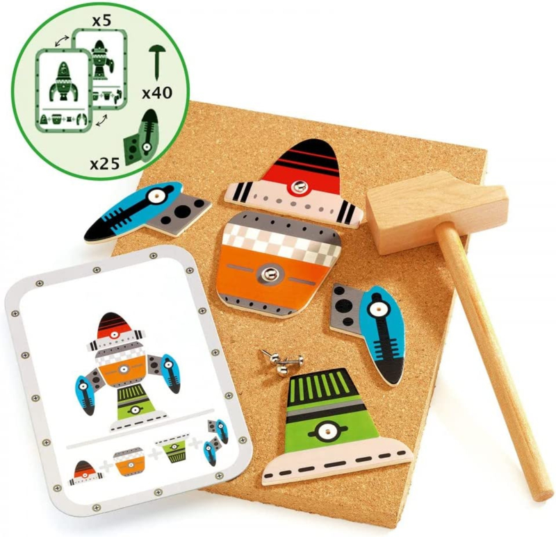 Artikelnummer: DJ06642Dit hamertje tic spel in de vorm van ruimteschepen is gemaakt van hout, metaal en kurk.