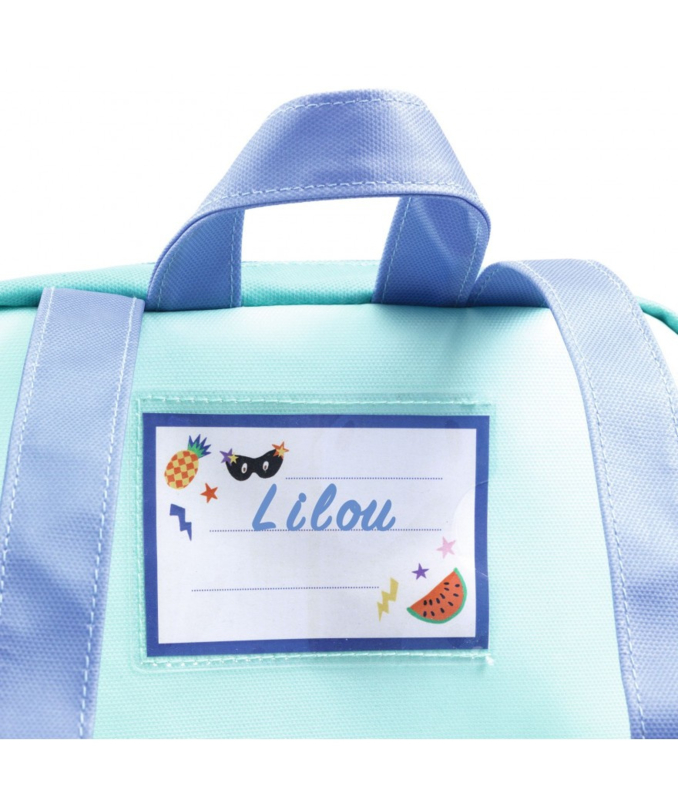 Op de achterkant van de tas is een etiket aangebracht waarop de naam van het kind wordt vermeld, zodat hij altijd kan worden teruggevonden.
