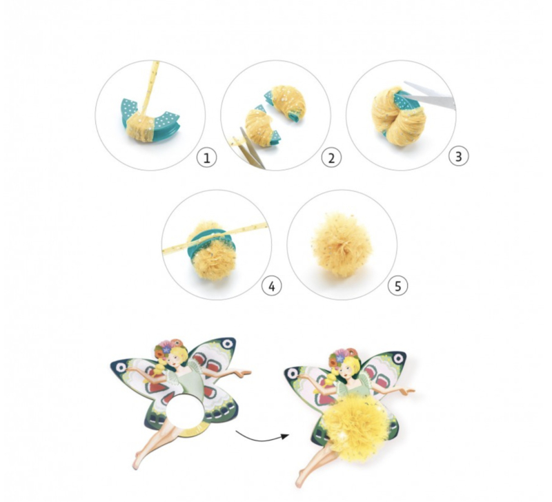 Inhoud: 1 opbergdoos, 1 magnetisch gereedschap, 3 kartonnen feeën, 3 rollen glittertule van 10 m (lichtroze, geel, turkoois) en 1 stap-voor-stap instructieboekje.