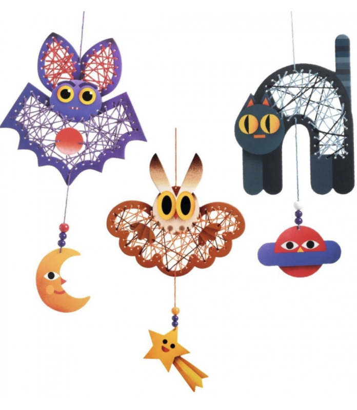 Artikelnummer: DJ09437Een set om 3 decoratieve "avond" mobielen te maken. Met een naald met ronde punt haalt het kind de draden door de doordrukte kaarten en over elkaar heen om de personages op te vullen. De creaties worden afgemaakt door de hangertjes met houten kralen toe te voegen.