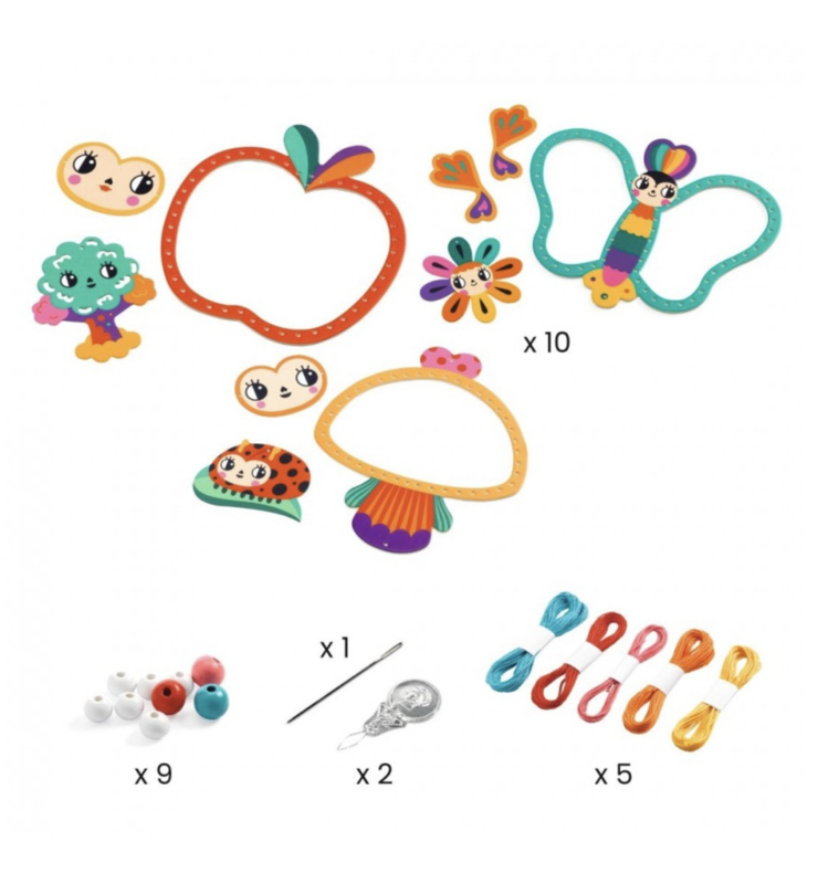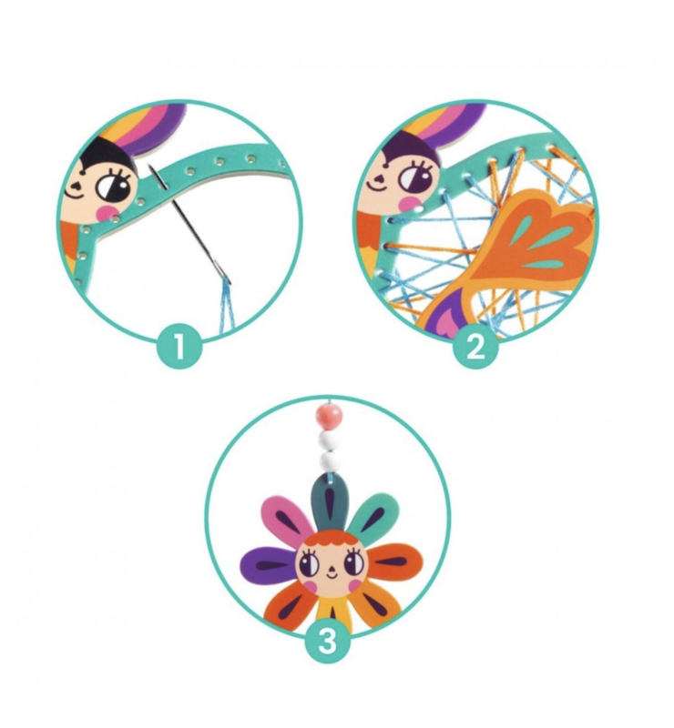 Artikelnummer: DJ09436Een set om 3 decoratieve "Kawai" mobielen te maken. Met een naald met ronde punt haalt het kind de draden door de doordrukte kaarten en over elkaar heen om de personages op te vullen. De creaties worden afgemaakt door de hangertjes met houten kralen toe te voegen.