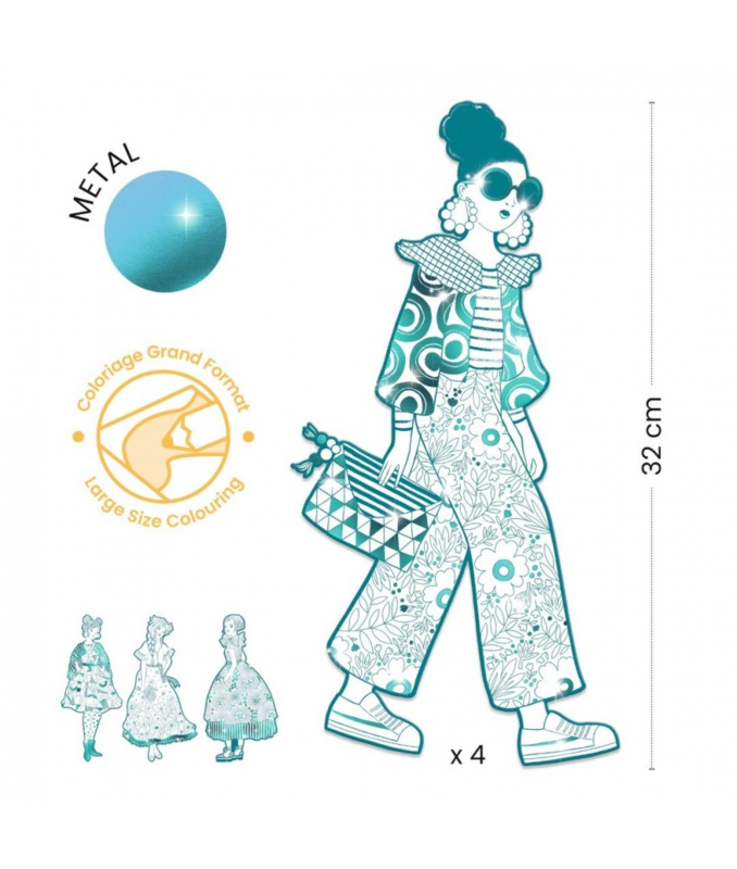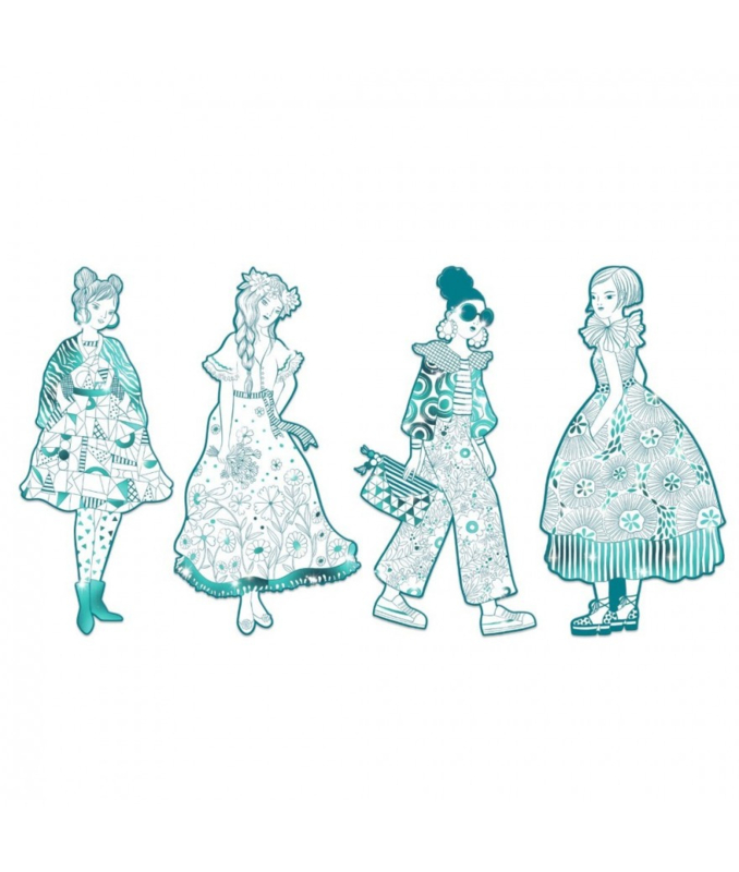 Vier grote silhouetkleurplaten van 32 cm hoog met outfits met uiteenlopende motieven en glanzende zones om de modellen nog meer stijl te geven!