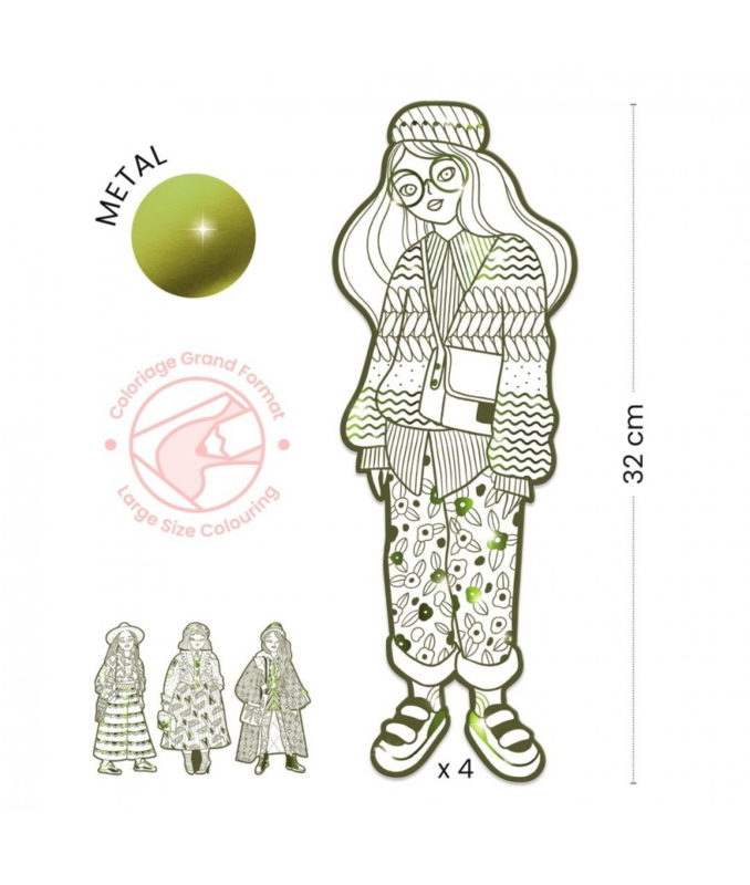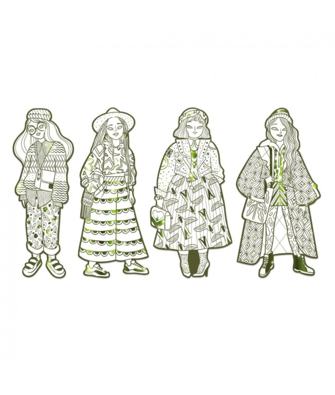 Vier grote silhouetkleurplaten van 32 cm hoog met outfits met uiteenlopende motieven en glanzende zones om de modellen nog meer stijl te geven!