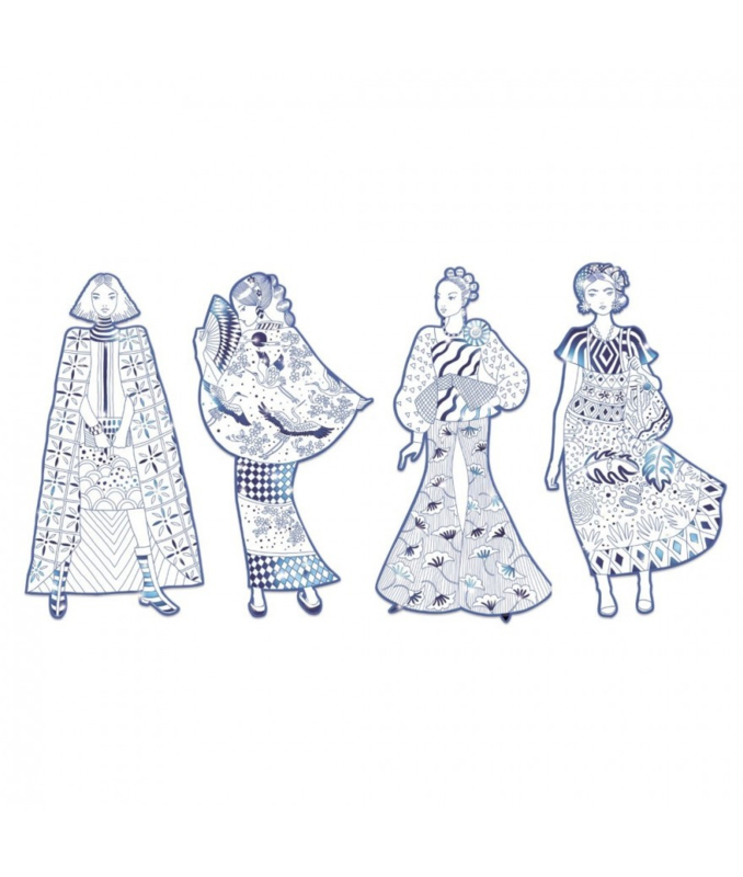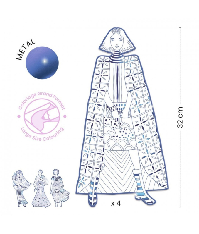 Vier grote silhouetkleurplaten van 32 cm hoog met outfits met uiteenlopende motieven en glanzende zones om de modellen nog meer stijl te geven!